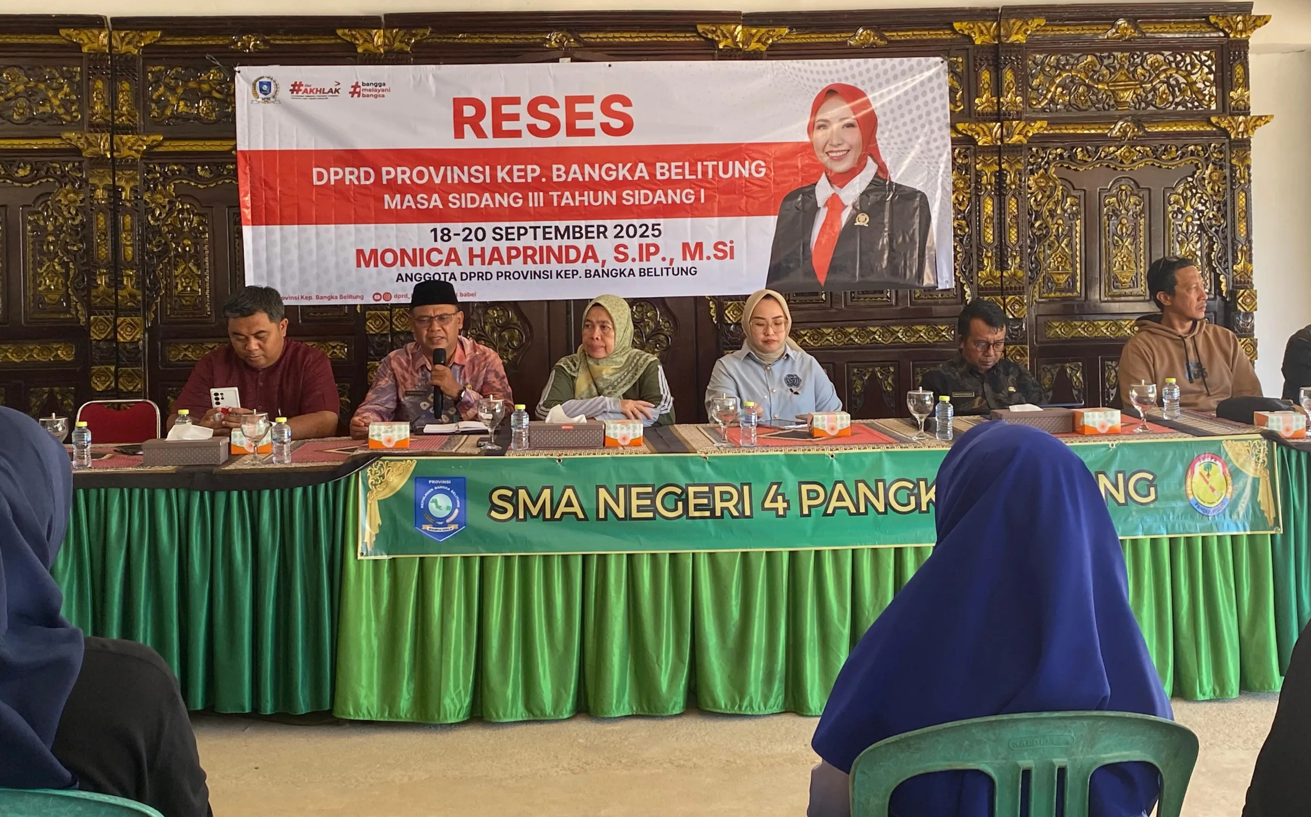 PANGKALPINANG, aquilaindonesia.com – Anggota DPRD Provinsi Kepulauan Bangka Belitung, Monica Haprinda, S.IP, M.Si, melaksanakan kegiatan reses masa sidang III tahun sidang I di SMA Negeri 4 Pangkalpinang, Jumat (19/9/2025) pukul 09.00 WIB. Reses ini dihadiri perwakilan Biro Kesra Babel, Dinas Pendidikan Babel, Kepala Sekolah, Komite, guru, serta siswa-siswi SMA Negeri 4 Pangkalpinang.